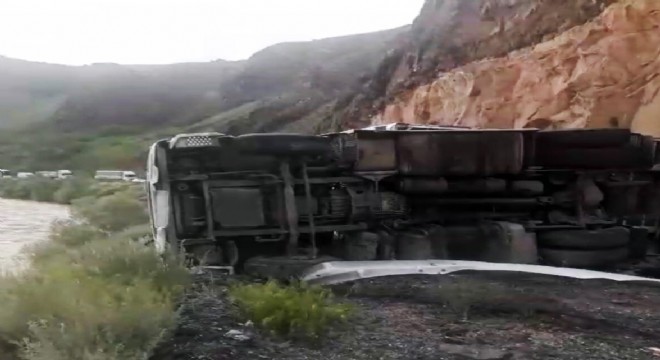Sarıkamış’ta sürücüsünün direksiyon hakimiyetini kaybettiği tır yan yattı. Bariyerlere çarparak duran tır, Aras Nehri’ne uçmaktan son anda kurtuldu.