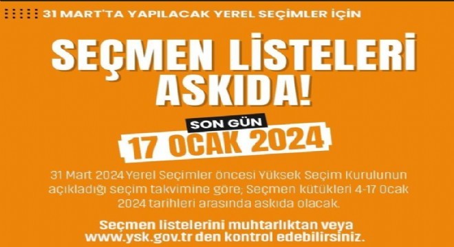 Türkiye seçim heyecanı yaşarken il ve ilçelerde seçmen listeleri askıya çıkarılacak. 31 Mart Mahalli İdareler Genel Seçimi takviminin belirlenmesinin ardından muhtarlık bölgesi listeleri, askıya çıkıyor. 4-17 Ocak tarihleri arasında askıda kalacak listelerde, oy verme günü itibarıyla 18 yaşını dolduracak, geçerli yerleşim yeri adresine sahip vatandaşlara, ait bilgiler yer alıyor. Seçmenler askıya çıkan seçmen listelerini muhtarlıklardan veya YSK’nın internet adresinden kontrol edebilecekler, İtirazlar, İlçe Nüfus Müdürlüğü’ne yapılacak. Düzeltme işlemi sonrasında, vatandaşlar dilerlerse İlçe Seçim Kurulu Başkanlığı’na başvurabilecekleri gibi İlçe Nüfus Müdürlüğü aracılığıyla da İlçe Seçim Kurulu Başkanlığı’na belgelerini iletilebilecekler.