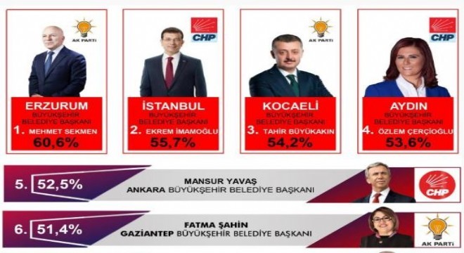 Sonar Araştırma, en başarılı büyükşehir belediye başkanları anketinin sonuçlarını yayınladı. Çalışmanın sonuçlarına göre ilk sırada Erzurum Büyükşehir Belediye Başkanı Mehmet Sekmen yer aldı. Yapılan ankette yüzde 60.6 oy oranıyla “Türkiye’nin En Başarılı Büyükşehir Belediye Başkanı” olarak seçilen Başkan Sekmen’i, İstanbul Büyükşehir Belediye Başkanı Ekrem İmamoğlu ve üçüncü olarak da Kocaeli Büyükşehir Belediye Başkanı Tahir Büyükakın takip etti. Ağustos - Eylül 2021 tarihleri arasında gerçekleşen çalışmada 19 bin kişinin görüşüne başvuruldu. Öte yandan kariyeri sürekli başarılarla dolu olan Erzurum Büyükşehir Belediye Başkanı Mehmet Sekmen, yatırım bütçesi kullanımında da 2016, 2017, 2018 ve 2019 yıllarında üst üste Türkiye birincisi seçilmişti.