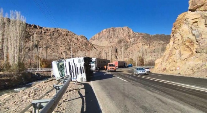Edinilen bilgilere göre, Artvin-Erzurum karayolunda seyir halinde olan 04 D 5511 plakalı kereste yüklü tır, Erzurum’un Uzundere ilçesi mevkiinde, keskin bir virajda direksiyon hakimiyetinin kaybedilmesi sonucu bariyerlerin üzerine devrildi. Sürüklenerek nehir kenarına kadar yaklaşan tır son anda durabilirken, tır sürücüsü ise şans eseri kazayı yara almadan atlattı.