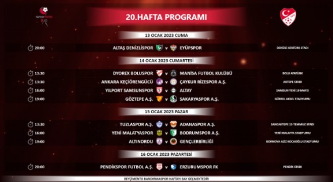 2022-2023 Sezonu Spor Toto 1. Lig 20-21. hafta müsabaka programı açıklandı. Programa göre Erzurumspor 20’inci haftada İstanbul deplasmanına gidecek. Pendikspor – Erzurumspor maçı 16 Ocak Pazartesi günü saat 20.00’de oynanacak. Mavi Beyazlılar 21’inci haftada ise Erzurum’da Göztepe’yi ağırlayacak. Maç 21 Ocak Cumartesi günü saat 13.30’da Kazım Karabekir stadında oynanacak.