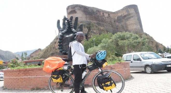 Bisikletiyle Türkiye turuna çıkan Senegalli öğrenci Mustafa Nidaye güzergâhı üzerindeki Oltu’ya uğradı.