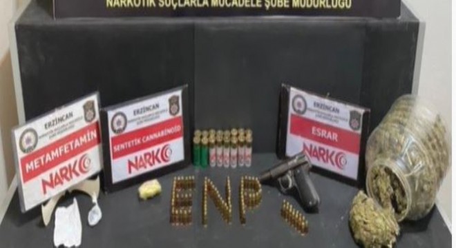 İl Emniyet Müdürlüğü İstihbarat, KOM, Özel Harekat ve Narkotik Suçlarla Mücadele Şube Müdürlüğü ekiplerince M.Ö. isimli şahsın ikametinde yapılan aramada; 1133,43 gram esrar, 2 parça halinde 4,03 gram metamfetamin, 1 parça halinde pamuğa emdirilmiş 8,55 gram sentetik cannabinoid, 1 adet 7,65 çapında silah ve silaha ait 2 adet fişek, 88 adet 9 mm fişek, 12 kalibre 16 adet av tüfeği kartuşu ele geçirildi.