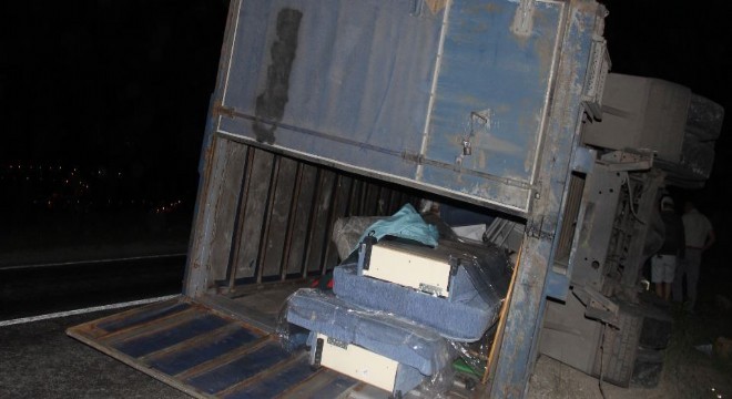 Virajı alamayan tır yan yattı