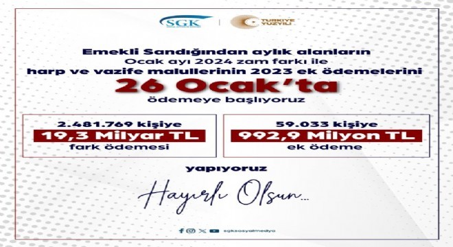 Sosyal Güvenlik Kurumu (SGK), Emekli Sandığından aylık alanların ocak ayı 2024 zam farkı ile harp ve vazife malullerinin 2023 ek ödemelerini 26 Ocak’ta yatırmaya başlayacaklarını duyurdu.